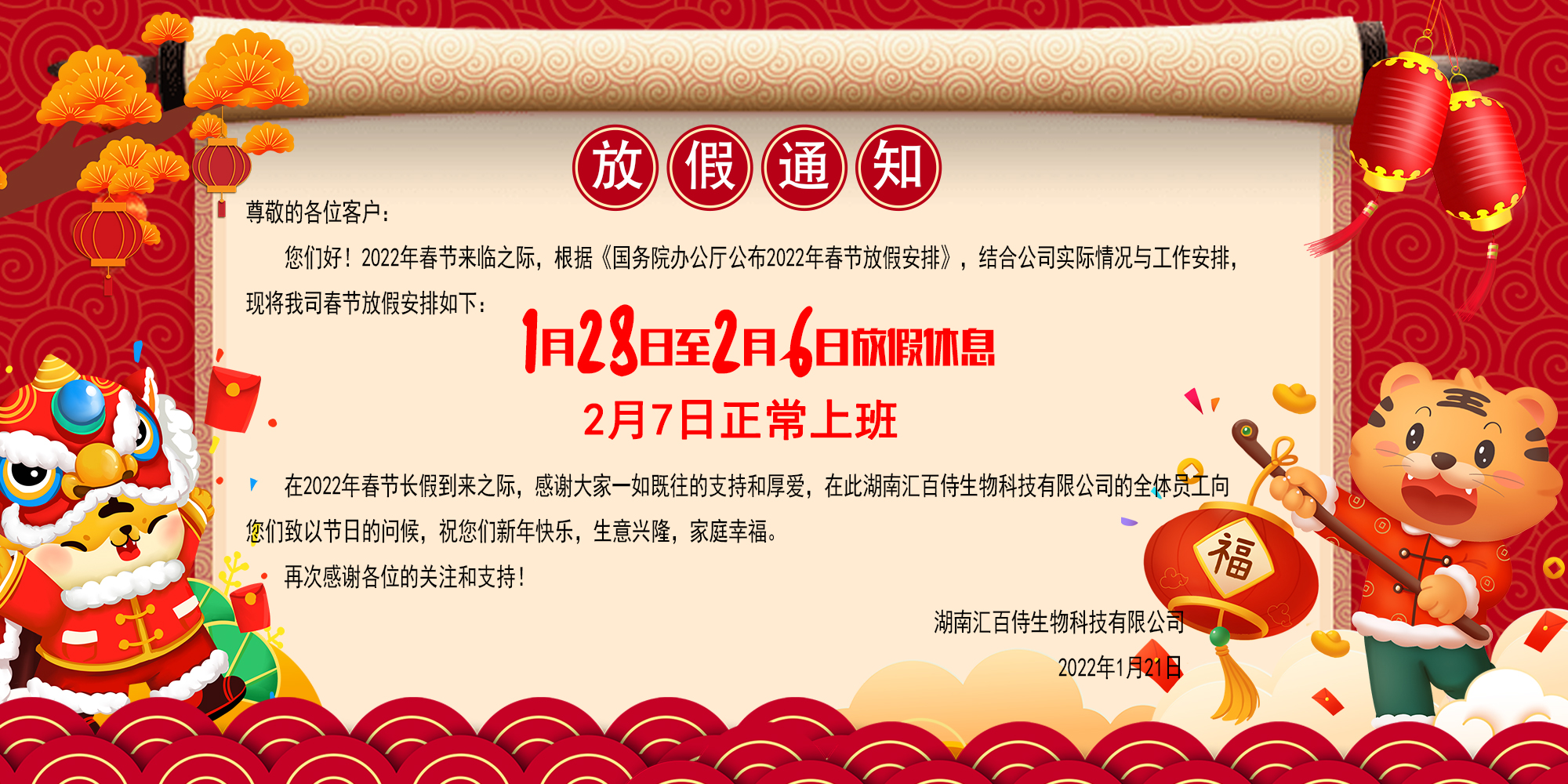 湖南匯百侍生物2022年春節(jié)放假通知